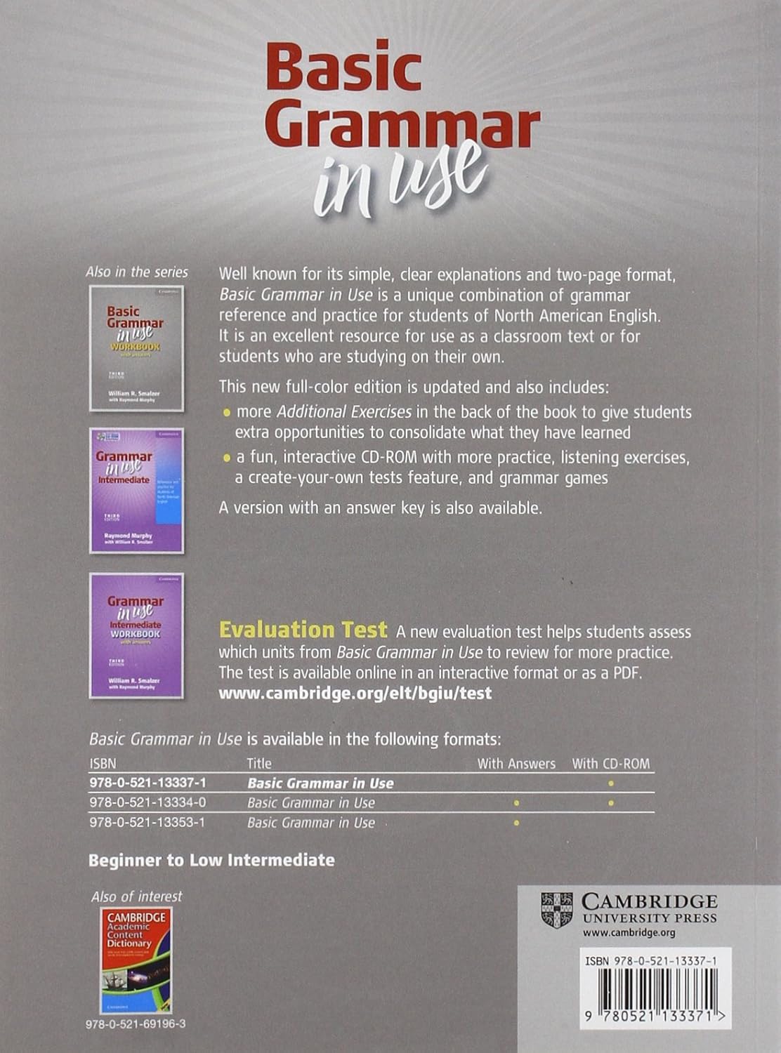 Basic Grammar in Use, Third edition, is the lower-level text in the Grammar in Use series. It focuses on the fundamental grammar structures normally taught in basic or introductory courses. Each of the 116 units in the Student's Book is presented in a two-page spread, with simple explanations on the left-hand page and practice exercises to check understanding on the right. This edition, without answers, can be used in the classroom or for self-study. It includes a CD-ROM featuring exercises, tests, and games.