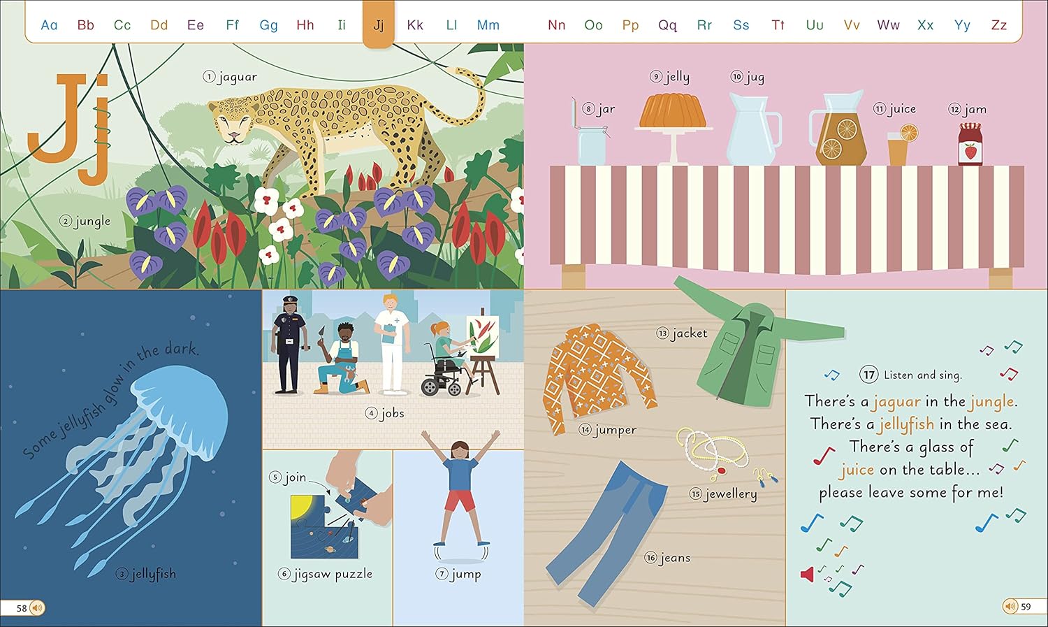 At the start of each section, the upper-case and lower-case version of each letter is presented to help reinforce letter recognition. Charming scenes and illustrations help put each word in context, and catchy songs make the process of learning and saying new words fun. A letter bar at the top of each page helps children remember the order of the alphabet and find their place in the book. Fun facts about the pictures help children build new vocabulary, and speech bubbles feature useful phrases and additional vocabulary. At the back of the book, a helpful reference section covers essential topics such as numbers, time, and shapes.
