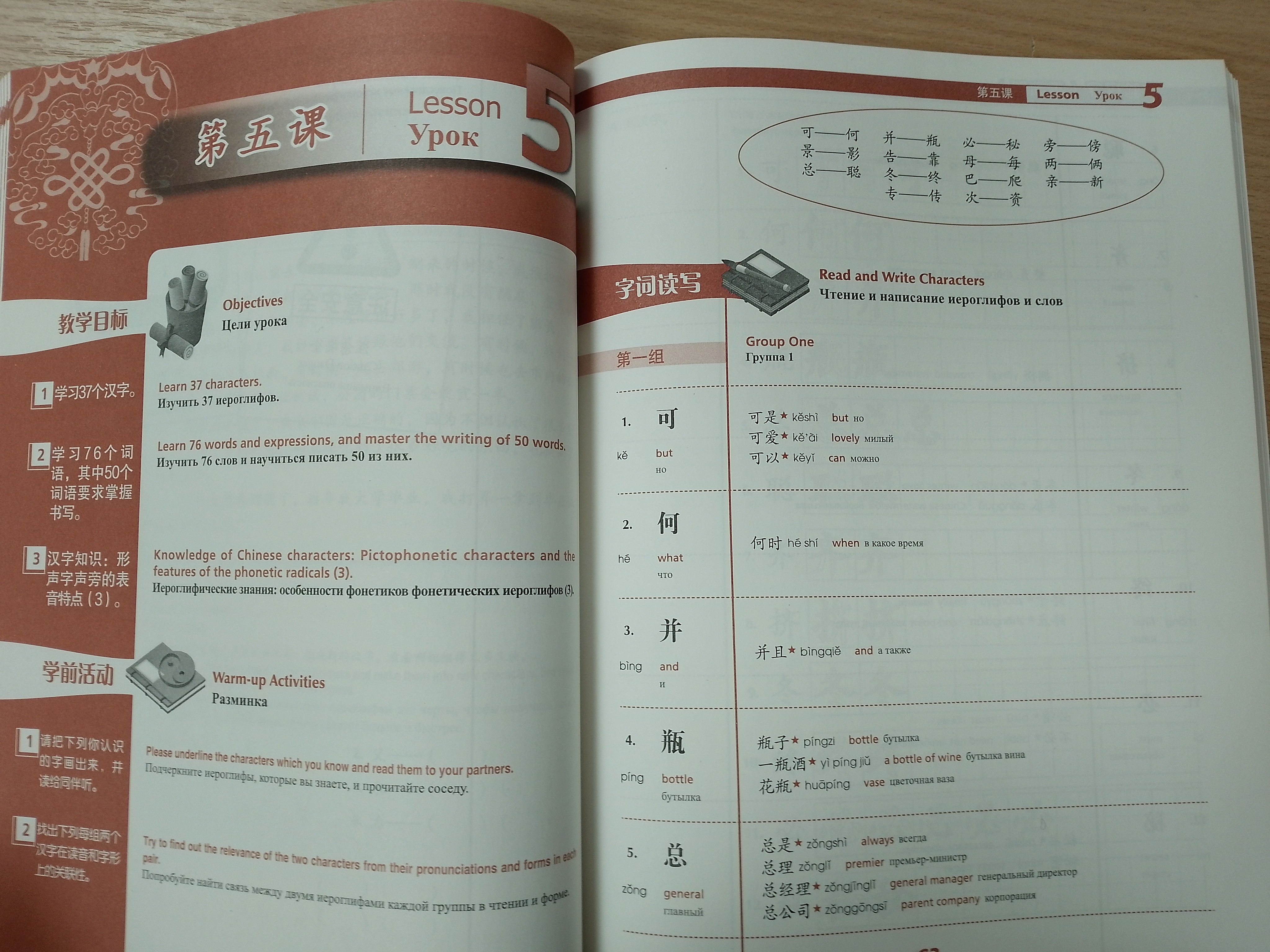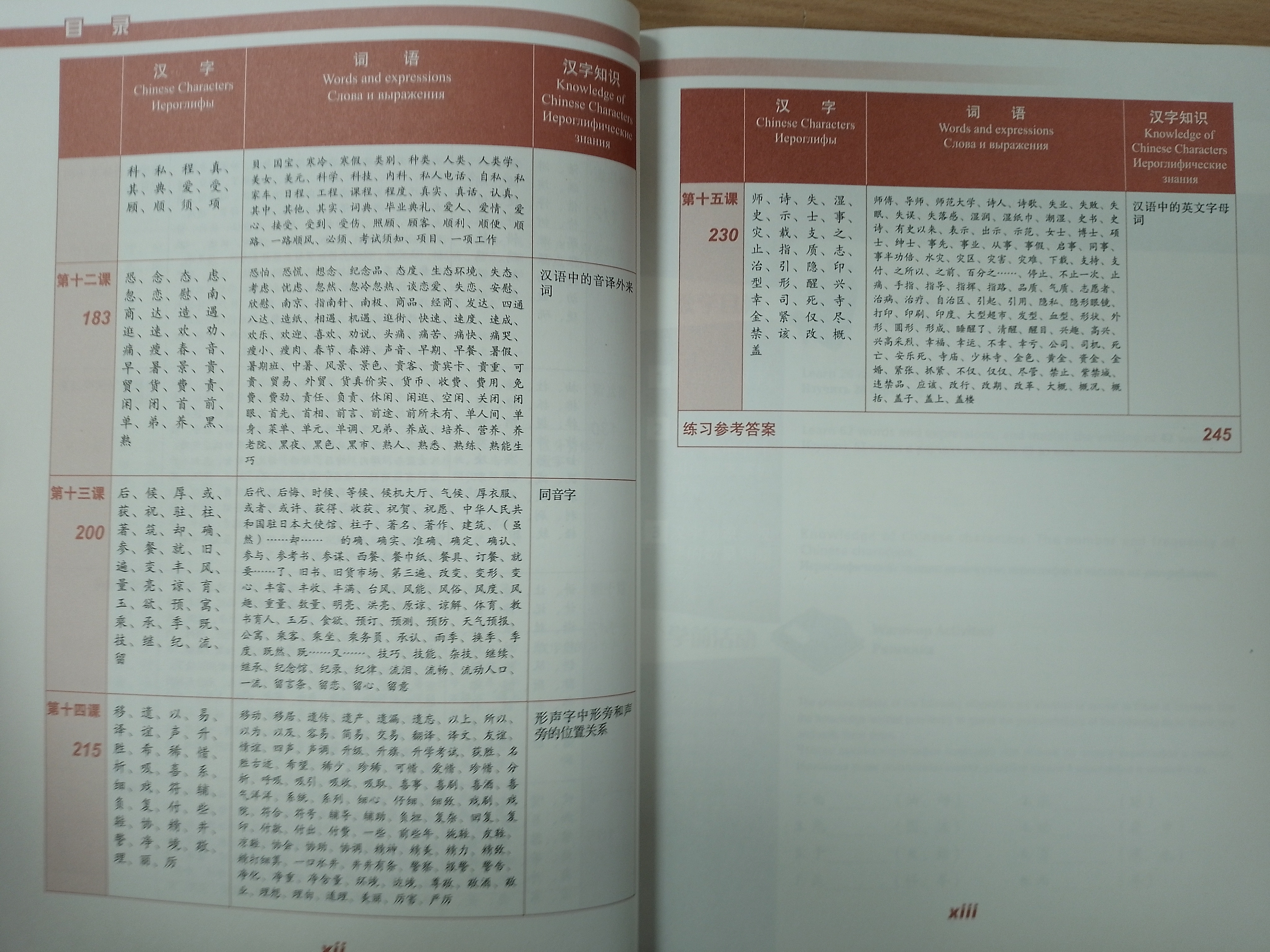 Пособие делится на 15 уроков и приложение с ответами к упражнениям. Каждый урок состоит из 5 блоков: "Цели урока", "Разминка", "Чтение и написание иероглифов", "Упражнения", "Иероглифические знания" и "Дополнительные упражнения".