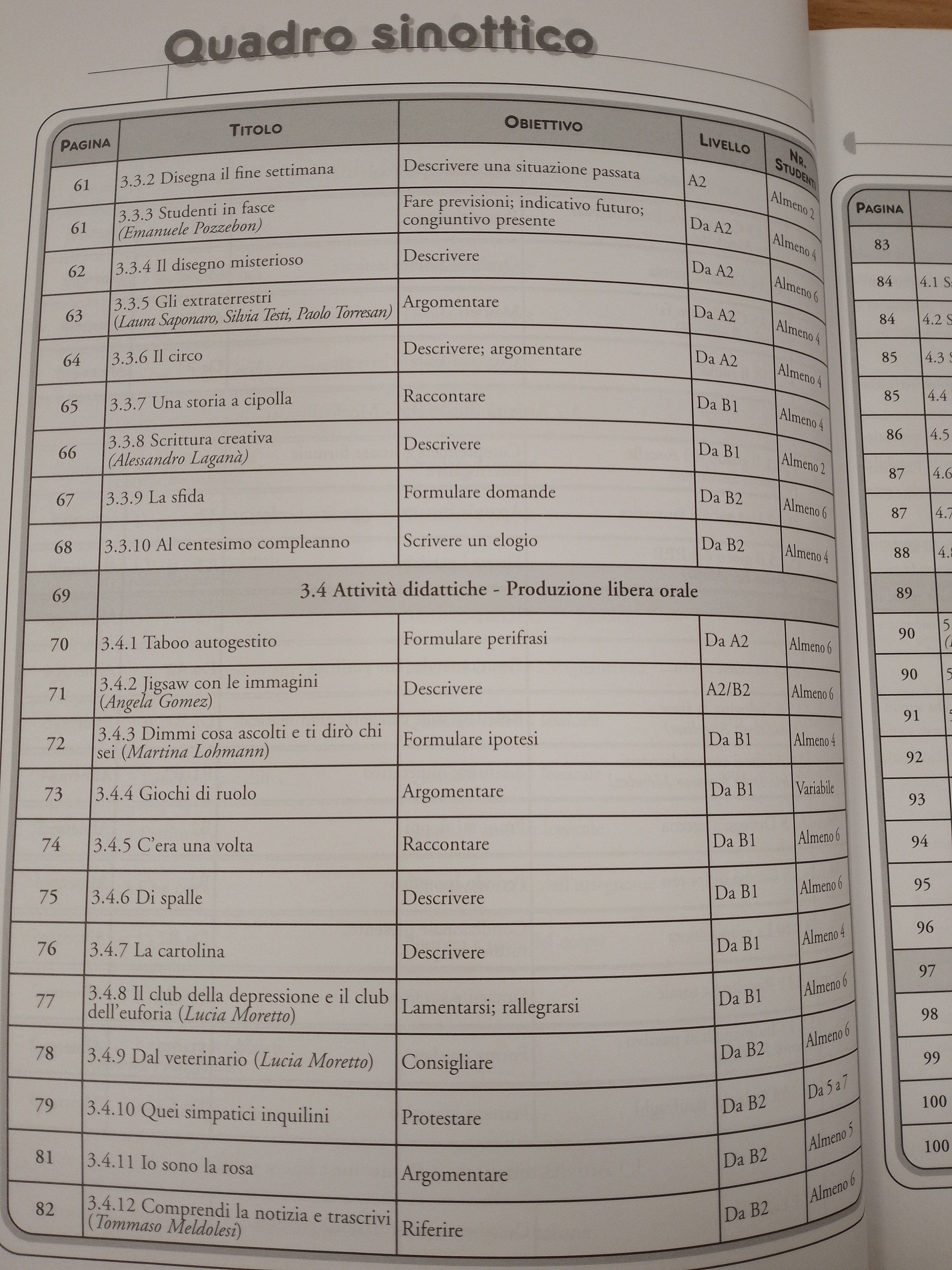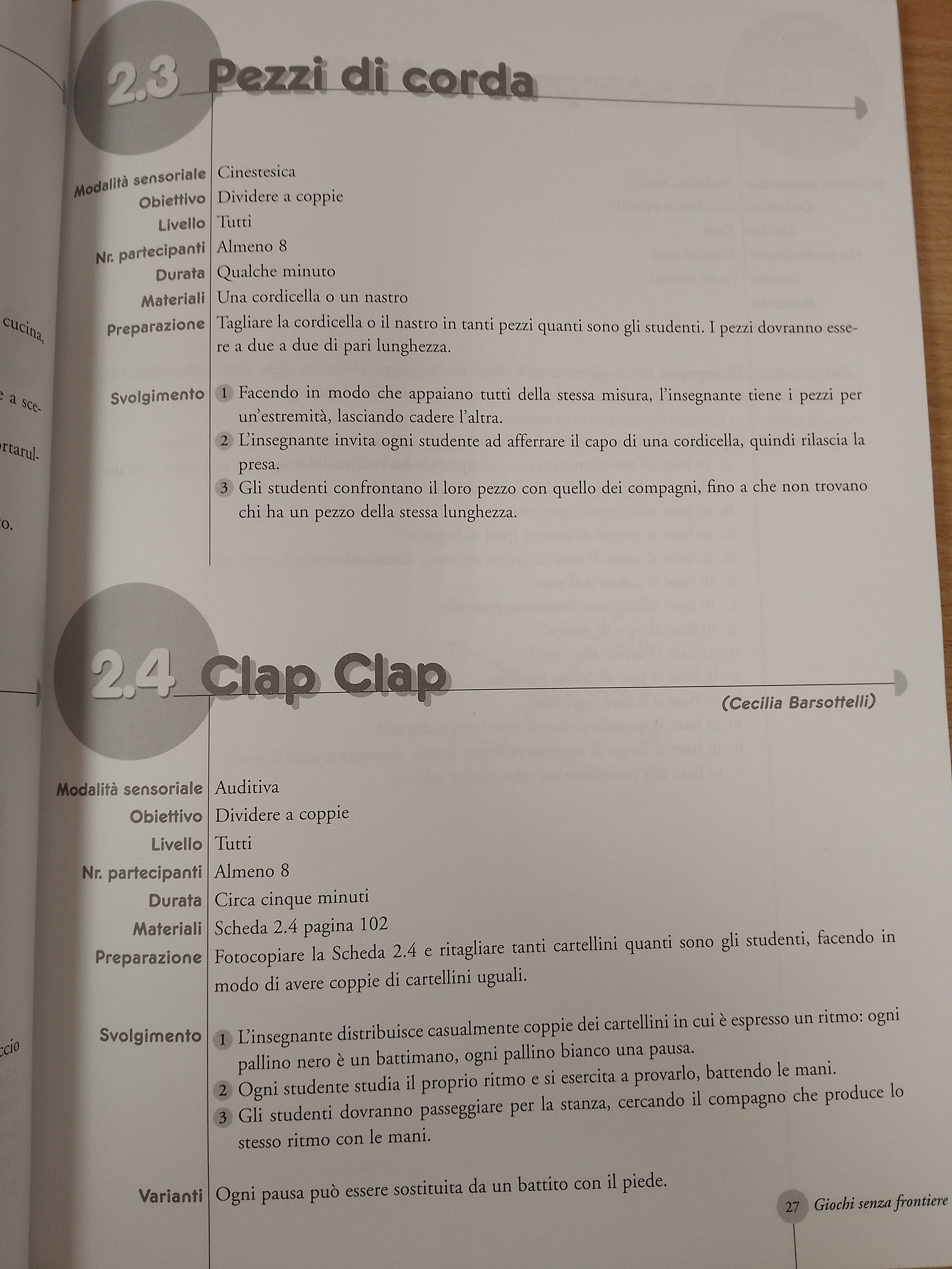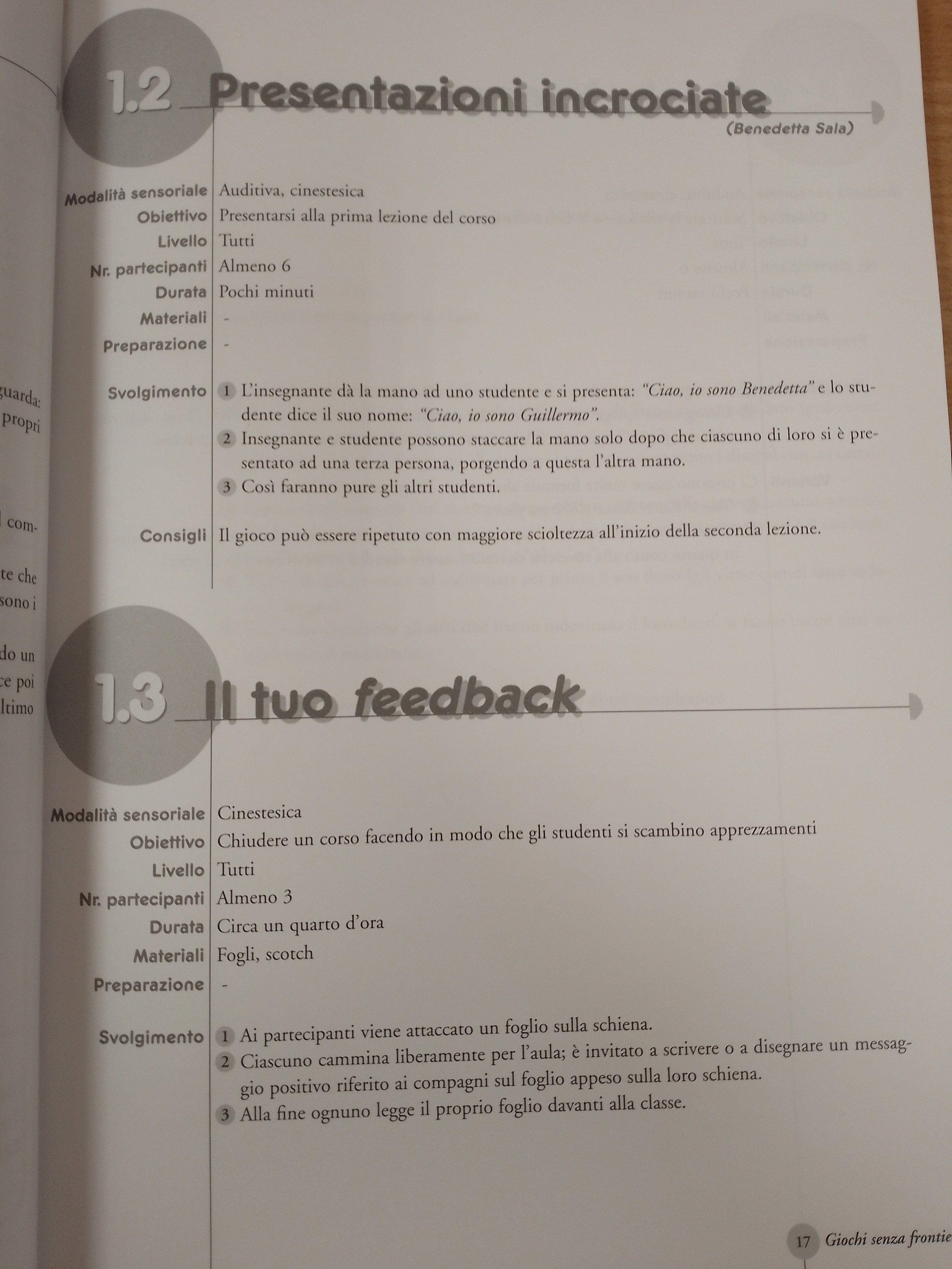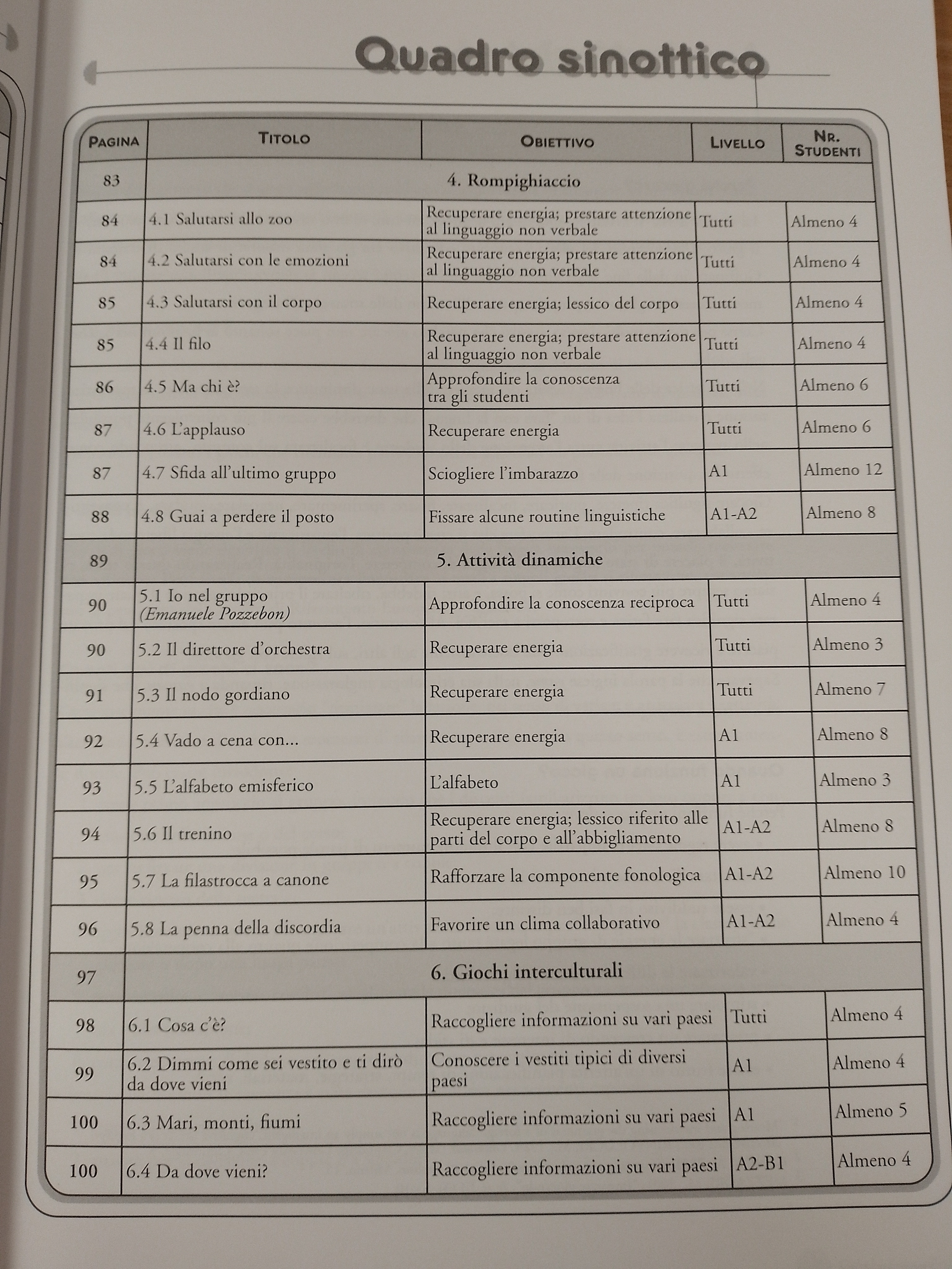 Le attività prettamente linguistiche, pur facendo la parte del leone, sono incastonate in una vera e propria filosofia del gioco come attività ricreativa, motivazionale, energetica, multisensoriale. Pertanto, accanto alle attività più classiche di comprensione e produzione orale e scritta, sono presentati anche moltissimi giochi per favorire la concentrazione, migliorare la dinamica di gruppo, rompere il ghiaccio, aprire e chiudere una lezione o un corso, formare gruppi o coppie, separare momenti diversi della lezione, creare rilassamento o ricaricare le energie.