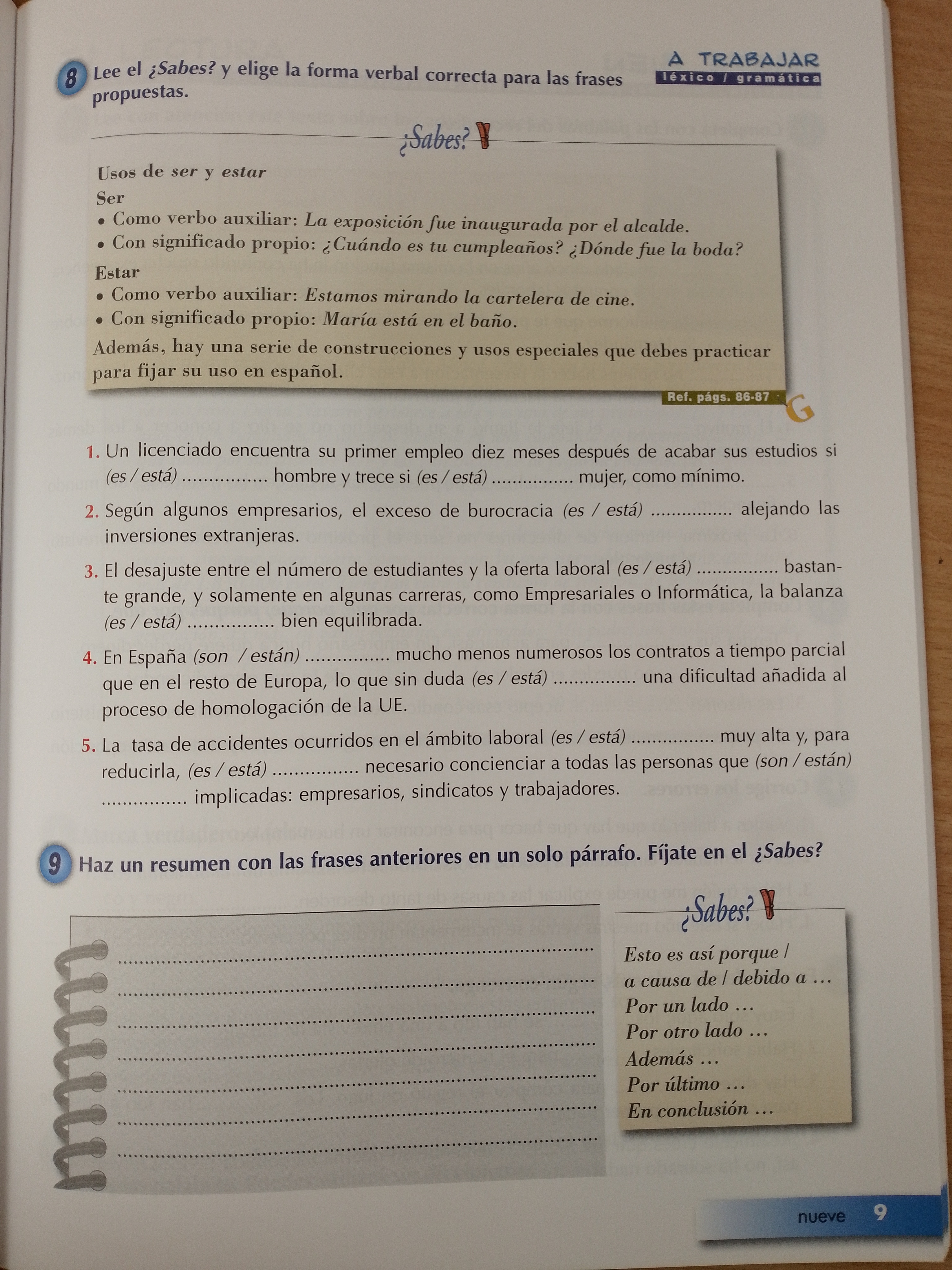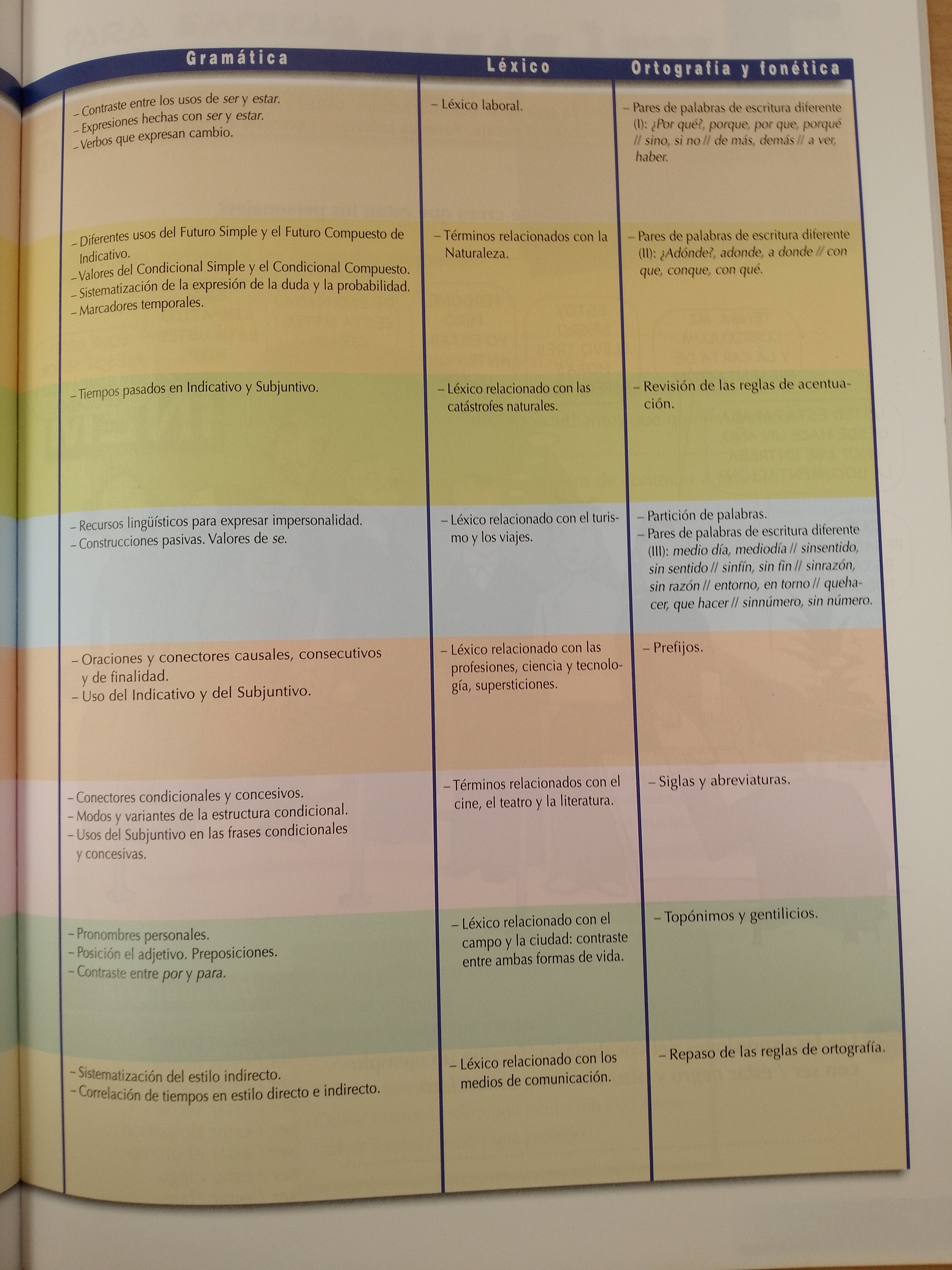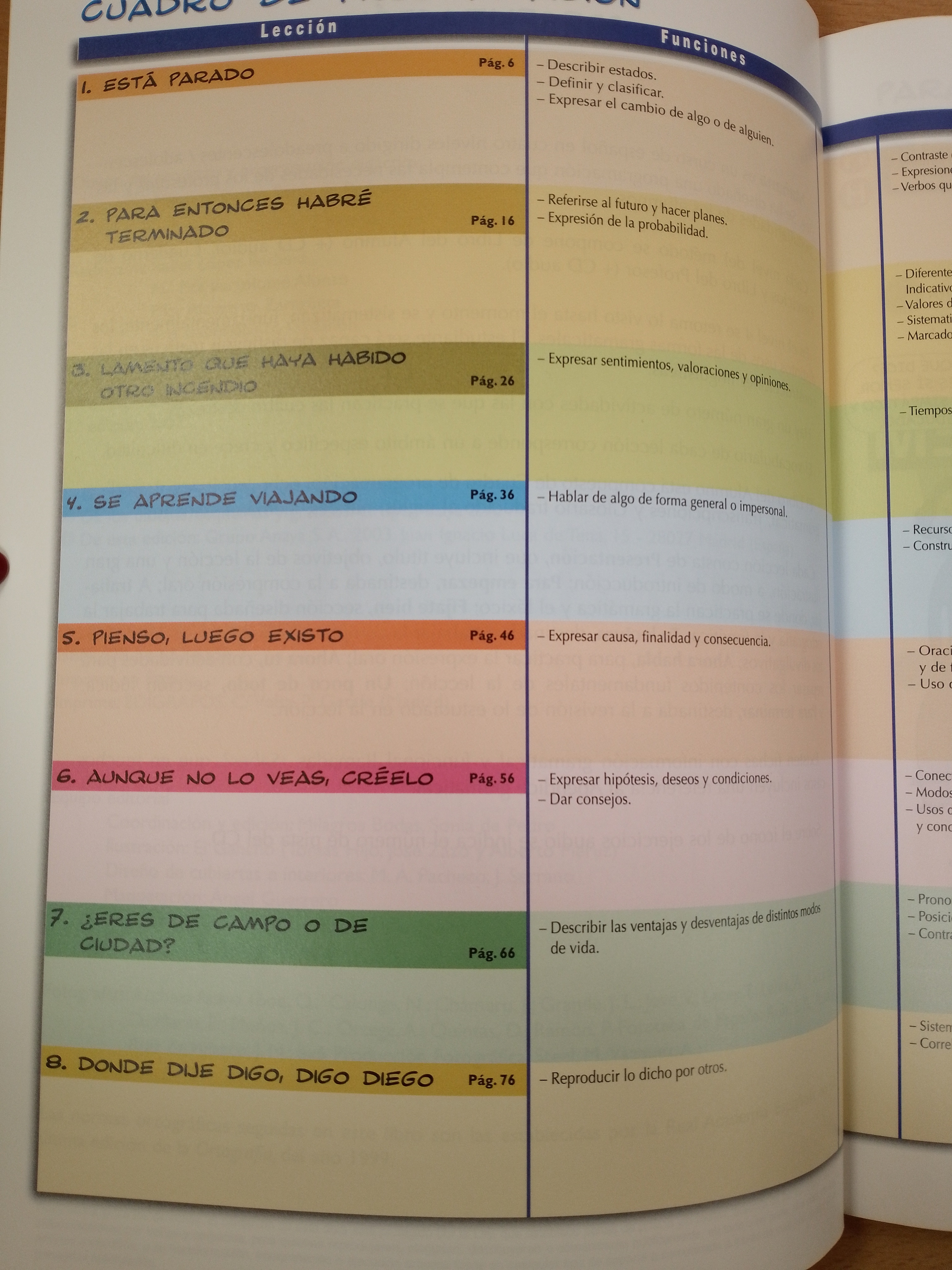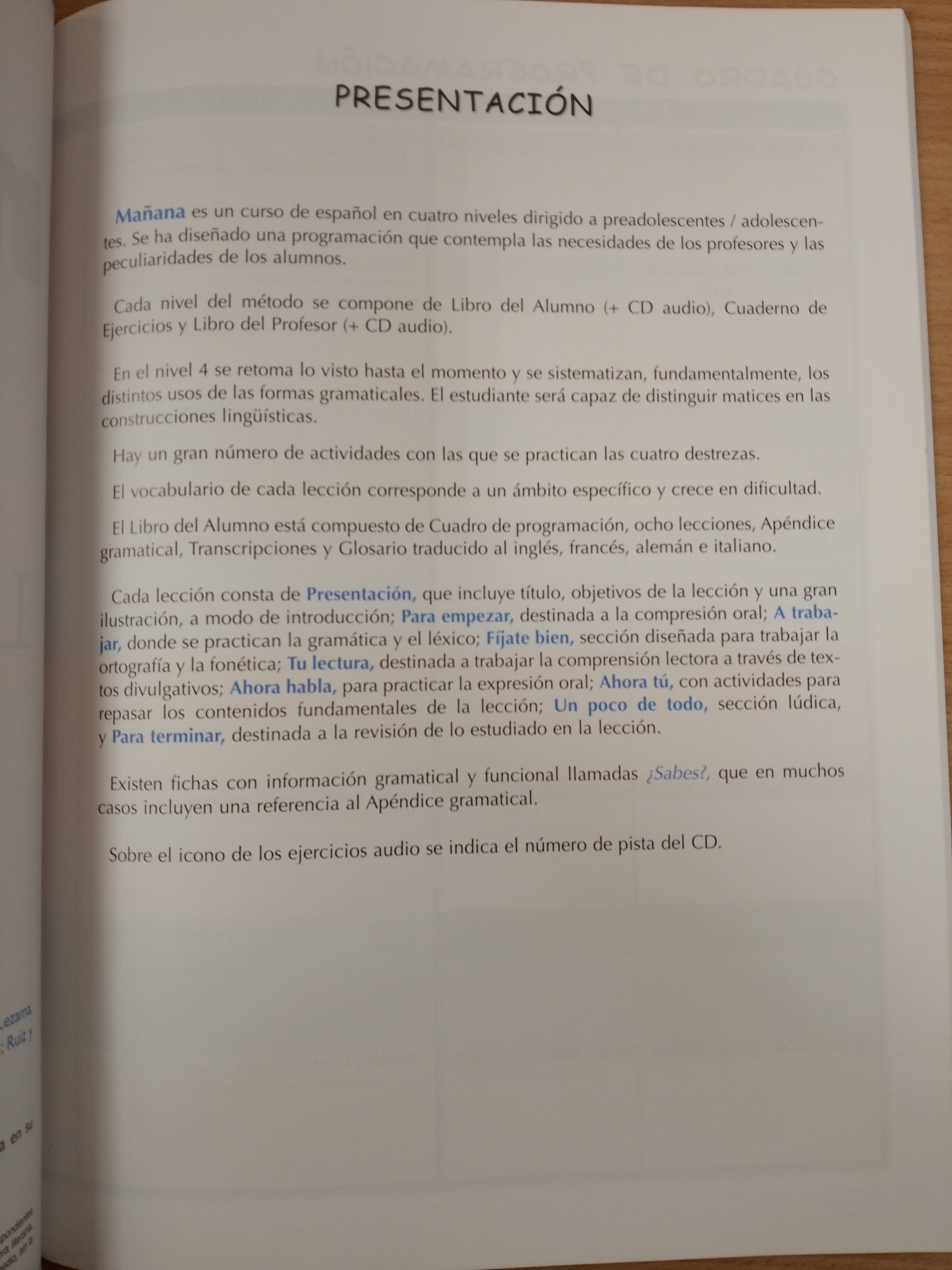 El Libro del Alumno está compuesto de Cuadro de programación, ocho lecciones, Apéndice gramatical, Transcripciones y Glosario traducido al inglés, francés, alemán e italiano.