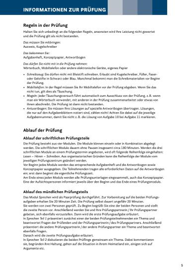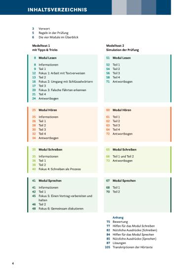 Im Anhang gibt es Redemittellisten zu den Prüfungsteilen Schreiben und Sprechen sowie kommentierte Lösungen und die Transkriptionen der Hörtexte.