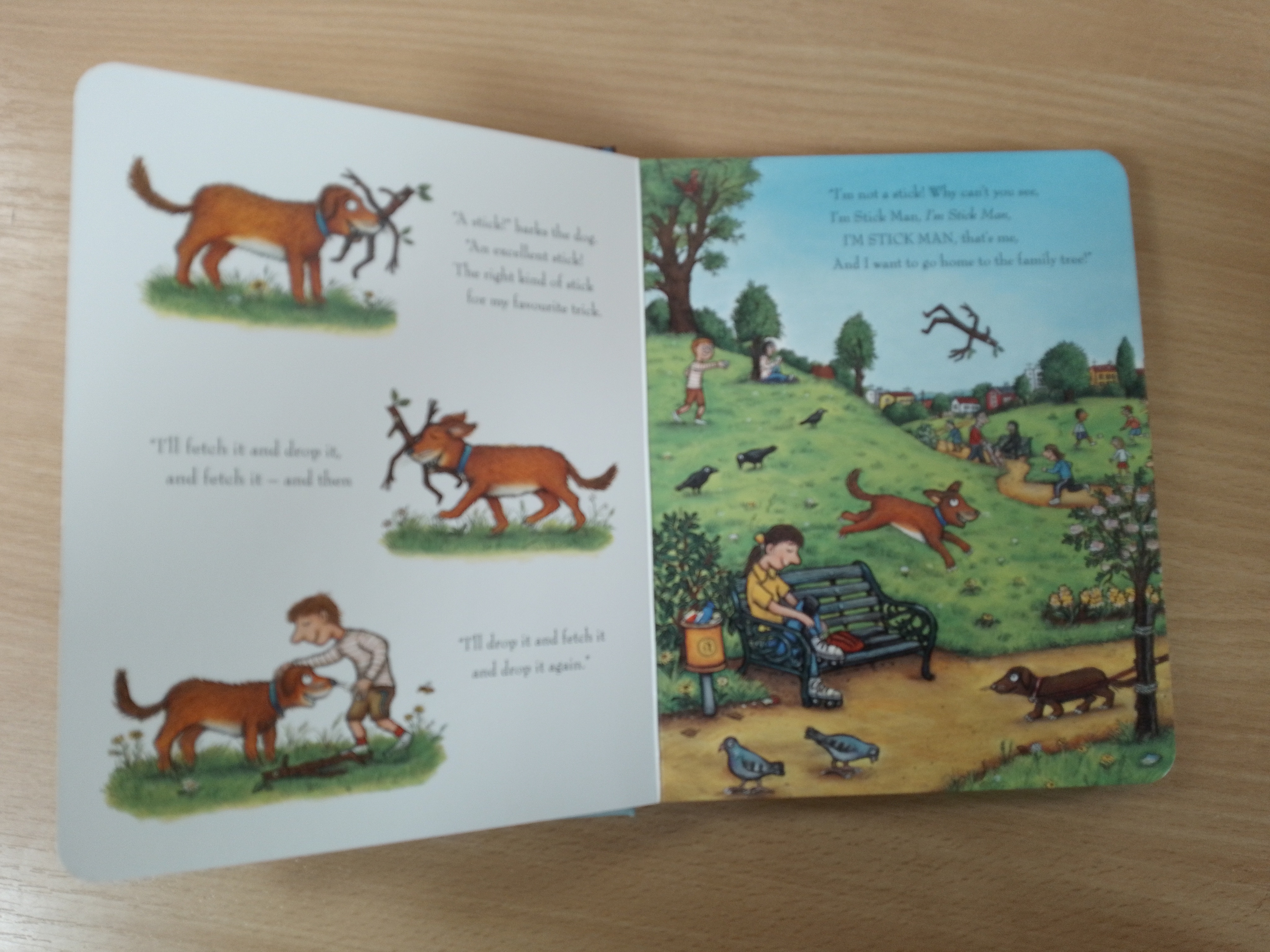 But it's dangerous being a Stick Man. A dog wants to play with him, a swan builds her nest with him. He even ends up on a fire!