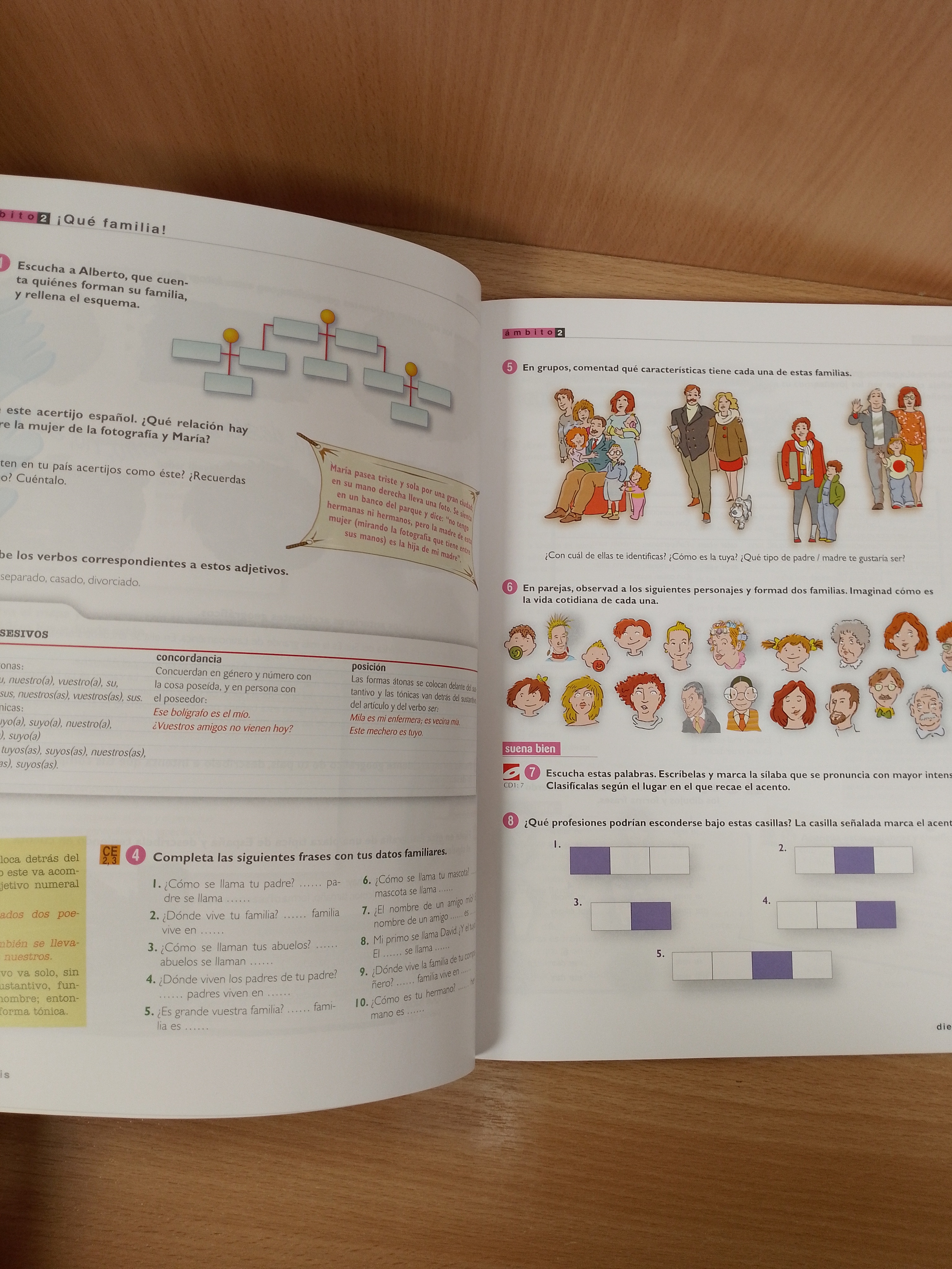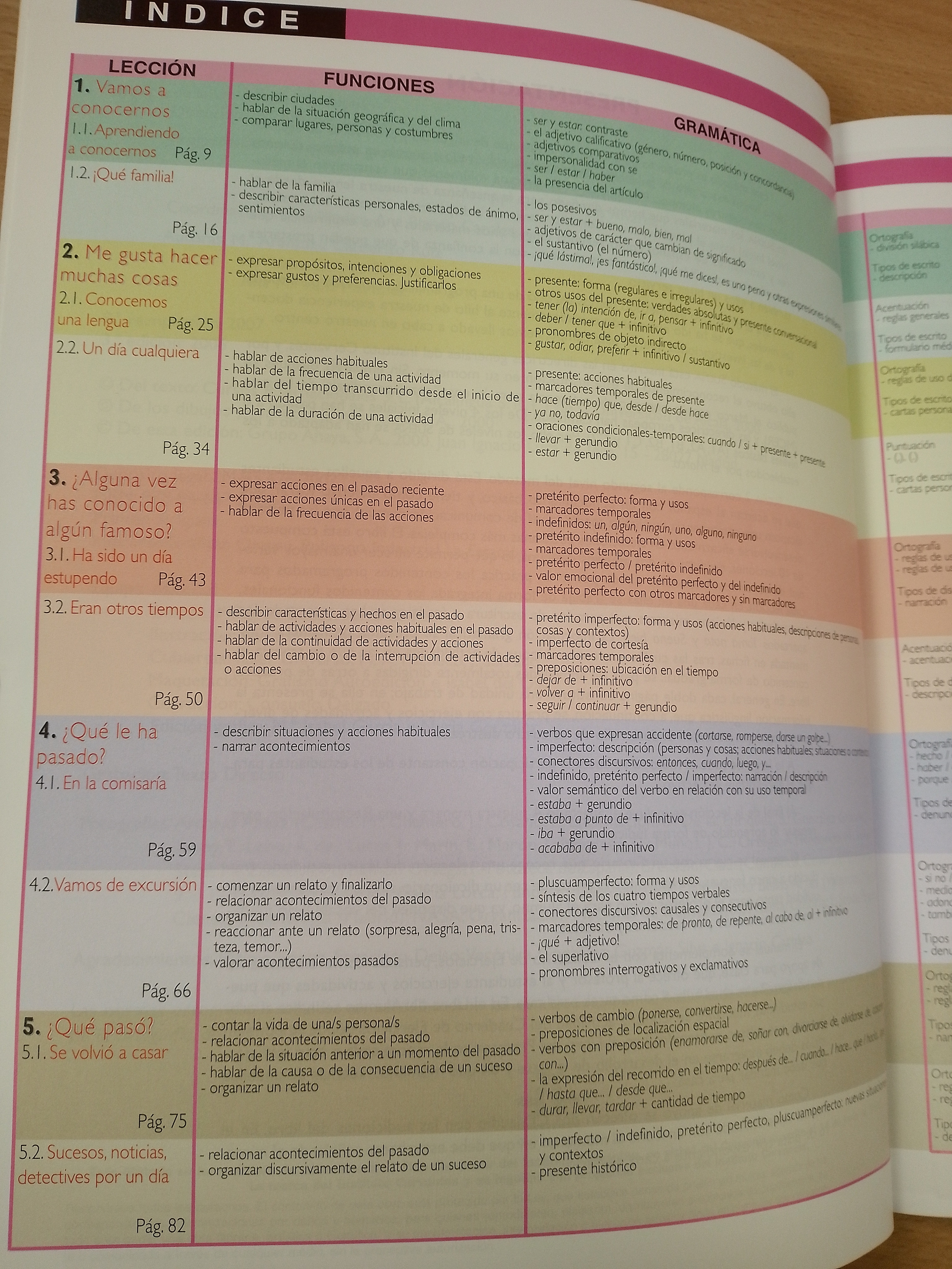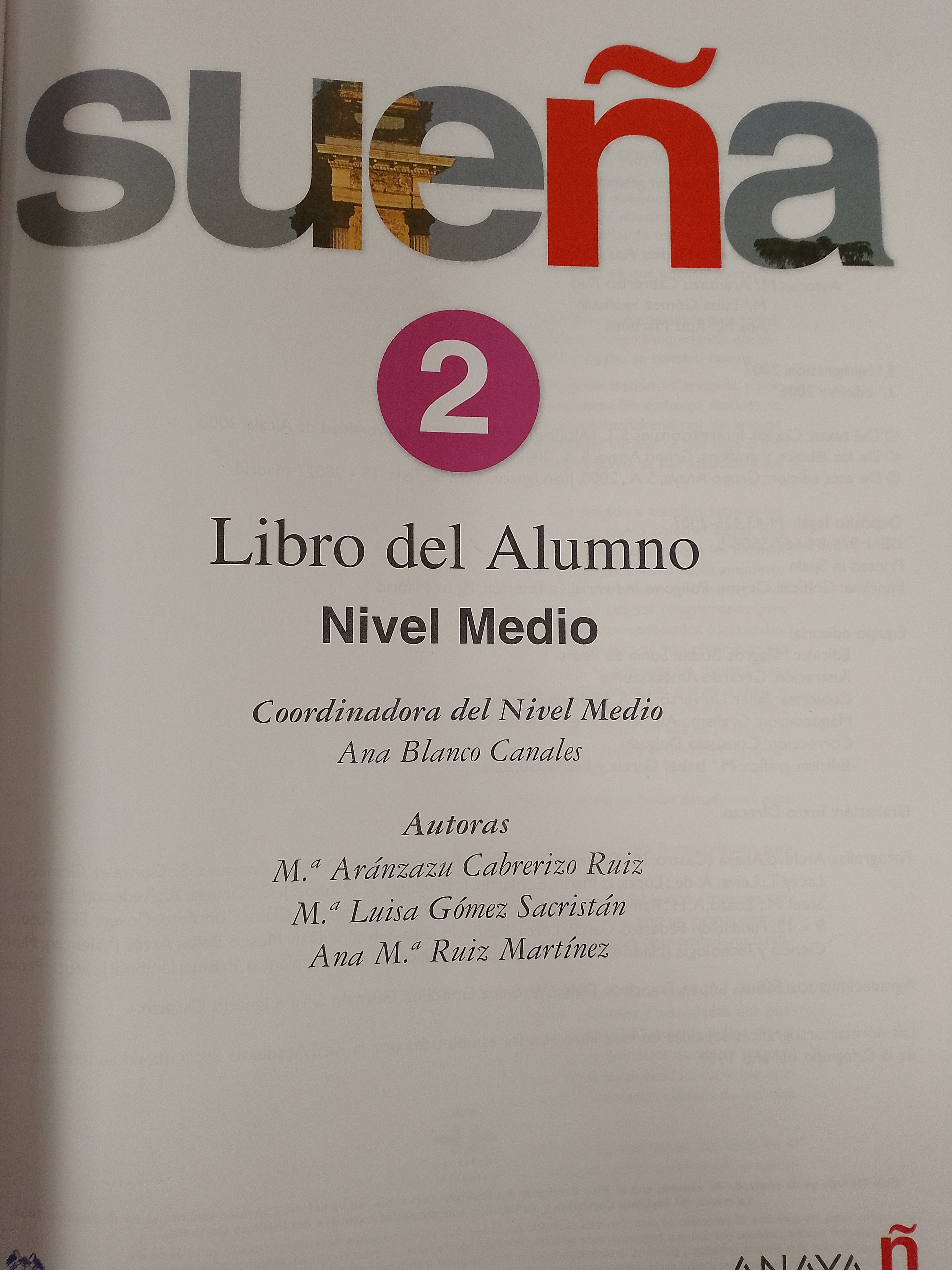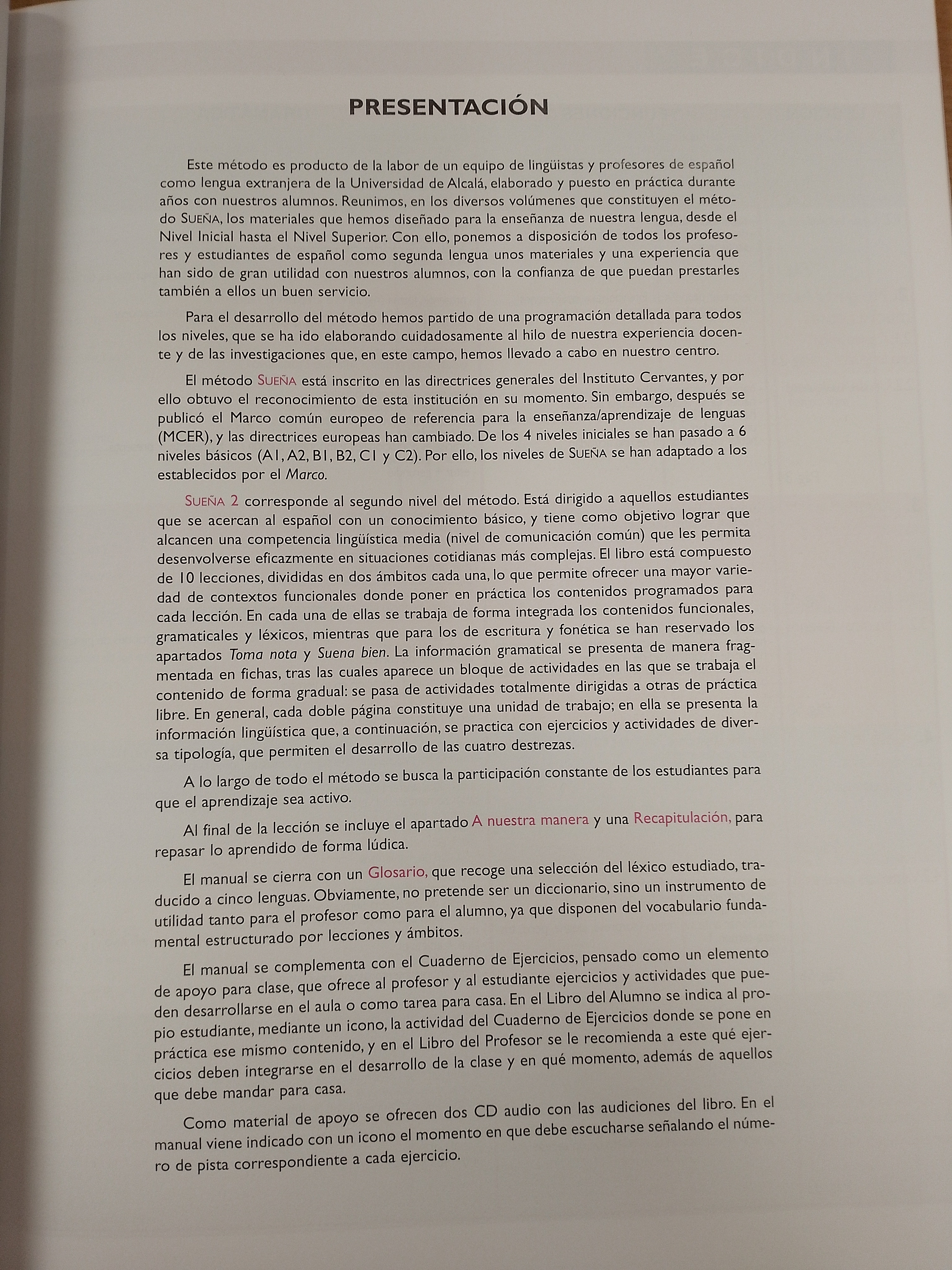 SUEÑA 2 corresponde al segundo nivel del método. Está dirigido a aquellos estudiantes que se acercan al español con un conocimiento básico, y tiene como objetivo lograr que alcancen una competencia lingüística media (nivel de comunicación común) que les permita desenvolverse eficazmente en situaciones cotidianas más complejas. El libro está compuesto de 10 lecciones, divididas en dos ámbitos cada una, lo que permite ofrecer una mayor varie-dad de contextos funcionales donde poner en práctica los contenidos programados para cada lección. En cada una de ellas se trabaja de forma integrada los contenidos funcionales, gramaticales y léxicos, mientras que para los de escritura y fonética se han reservado los apartados Toma nota y Suena bien. La información gramatical se presenta de manera frag-mentada en fichas, tras las cuales aparece un bloque de actividades en las que se trabaja el contenido de forma gradual se pasa de actividades totalmente dirigidas a otras de práctica libre. En general, cada doble página constituye una unidad de trabajo; en ella se presenta la información lingüística que, a continuación, se practica con ejercicios y actividades de diver-sa tipología, que permiten el desarrollo de las cuatro destrezas.
