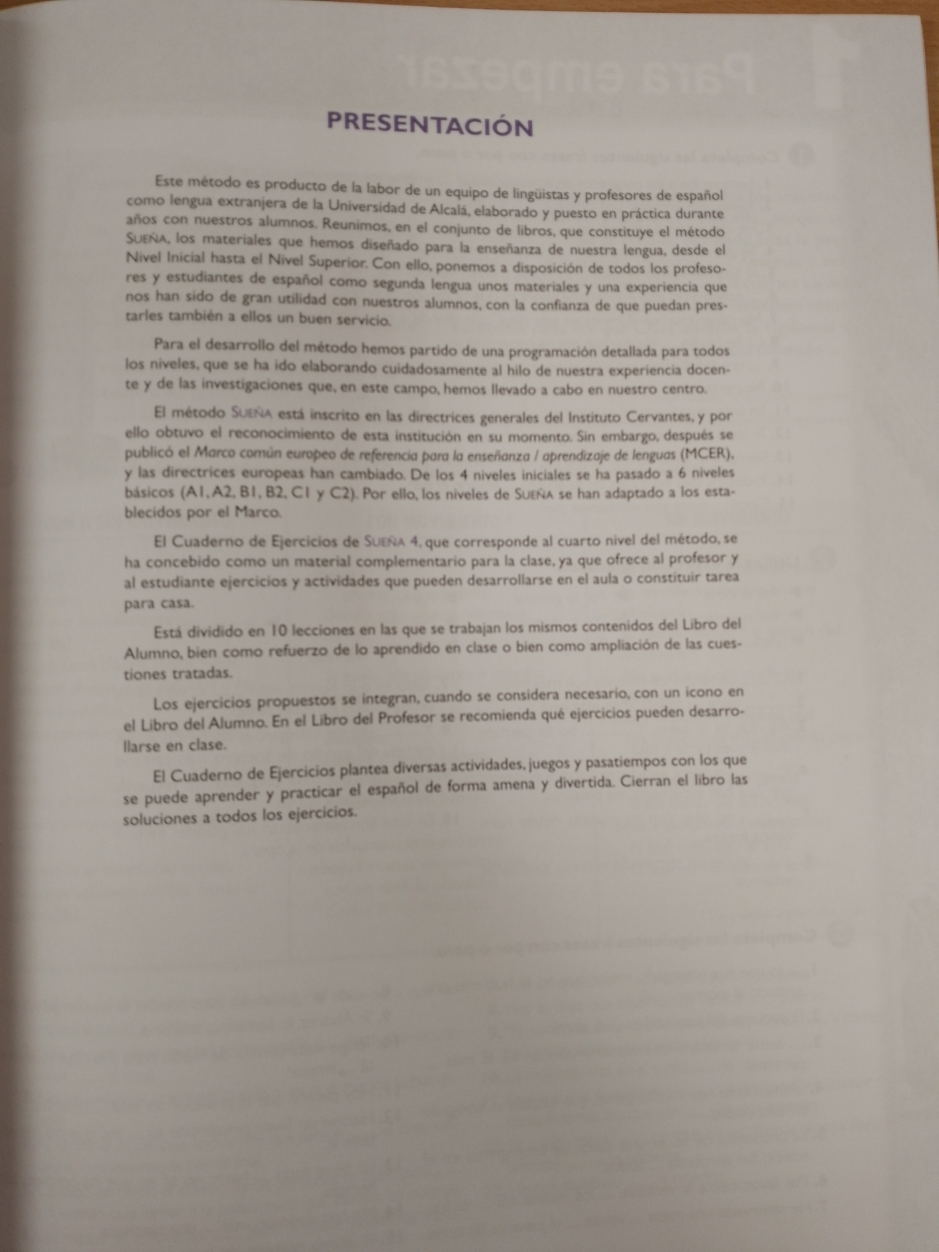 El Cuaderno de Ejercicios se ha concebido como un material complementario para la clase. Incluye actividades para ser realizadas en el aula o en casa. Está dividido en 10 lecciones, donde se trabajan los mismos contenidos del Libro del Alumno, bien como refuerzo de lo aprendido en clase o bien como ampliación de las cuestiones tratadas. Los ejercicios se integran, cuando se considera necesario, con un icono en el Libro del Alumno. En el Libro del Profesor se recomienda qué actividades del Cuaderno pueden desarrollarse en clase. El Cuaderno de Ejercicios plantea diversas actividades, juegos y pasatiempos con los que se puede aprender y practicar el español de forma amena y divertida. Sueña 4 se corresponde con el nivel C1 del Marco.
