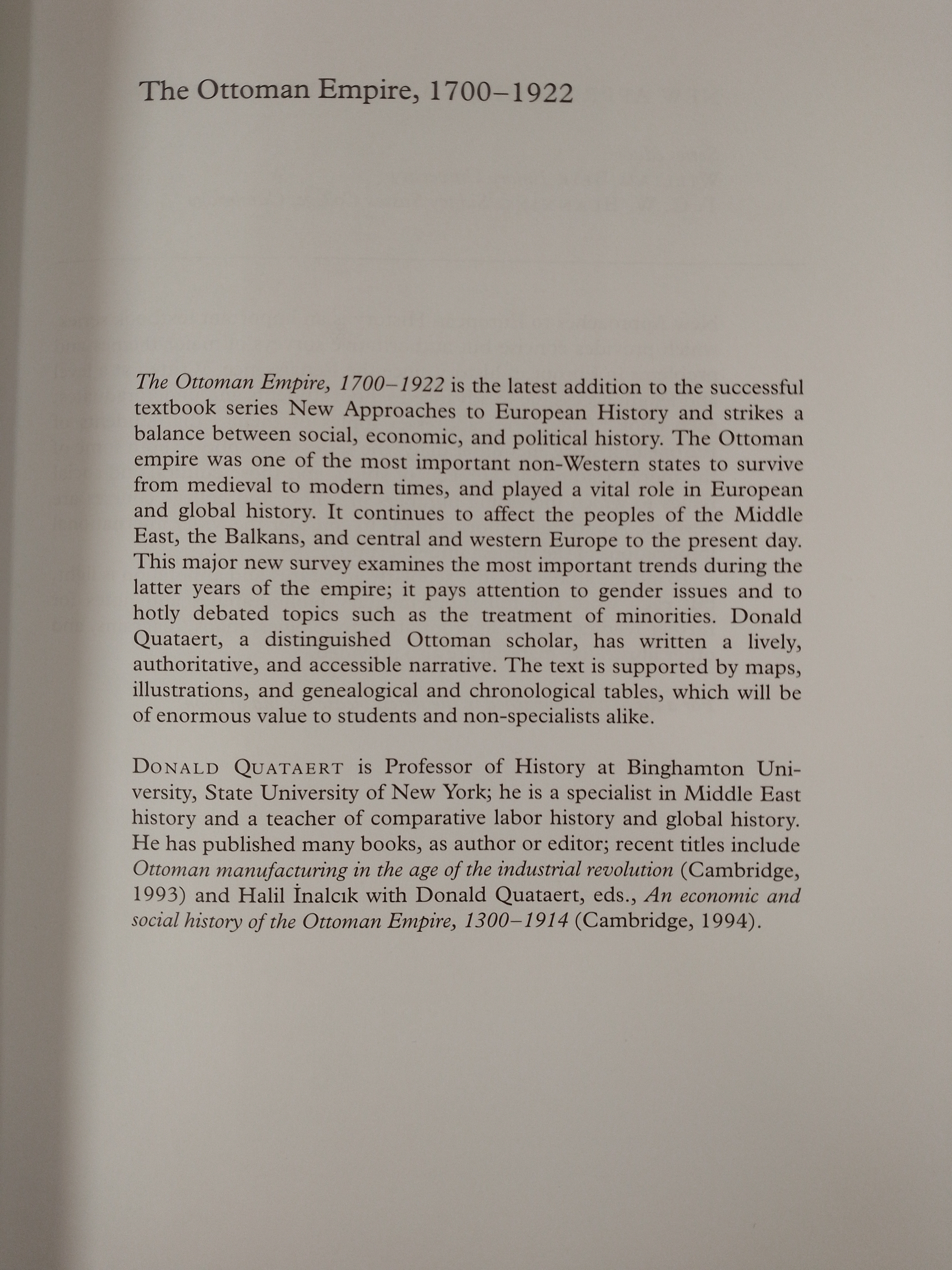 The Ottoman Empire, 1700–1922 is the latest addition to the successful textbook series New Approaches to European History, and strikes a balance between social, economic, and political history. The Ottoman Empire was one of the most important non-Western states to survive from medieval to modern times, and played a vital role in European and global history. It continues to affect the peoples of the Middle East, the Balkans and central and western Europe to the present day. This major new survey examines the most important trends during the latter years of the empire; it pays attention to gender issues and to hotly-debated topics such as the treatment of minorities. Donald Quataert, a distinguished Ottoman scholar, has written a lively, authoritative and accessible narrative. The text is supported by maps, illustrations and genealogical and chronological tables, which will be of enormous value to students and non-specialists alike.